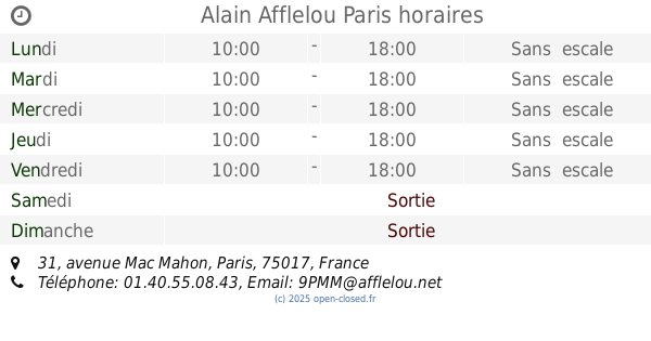 Add it to your website, your phone or even your desktop - opening times, phone numbers and the road to Store of the Alain Afflelou Dans Paris, 31, avenue Mac Mahon.