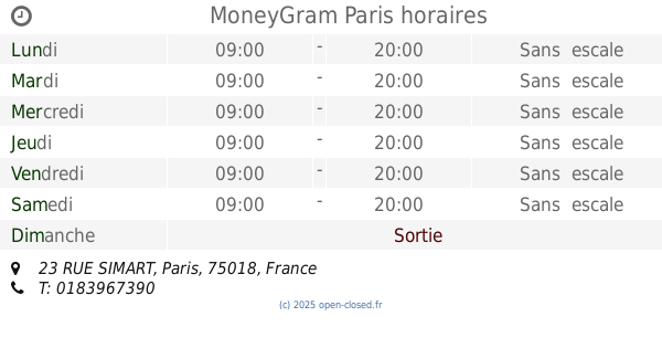 It is also possible to : Modifier ces HEURES D'OUVERTURE of Branche MoneyGram Dans Paris, 23 RUE SIMART,